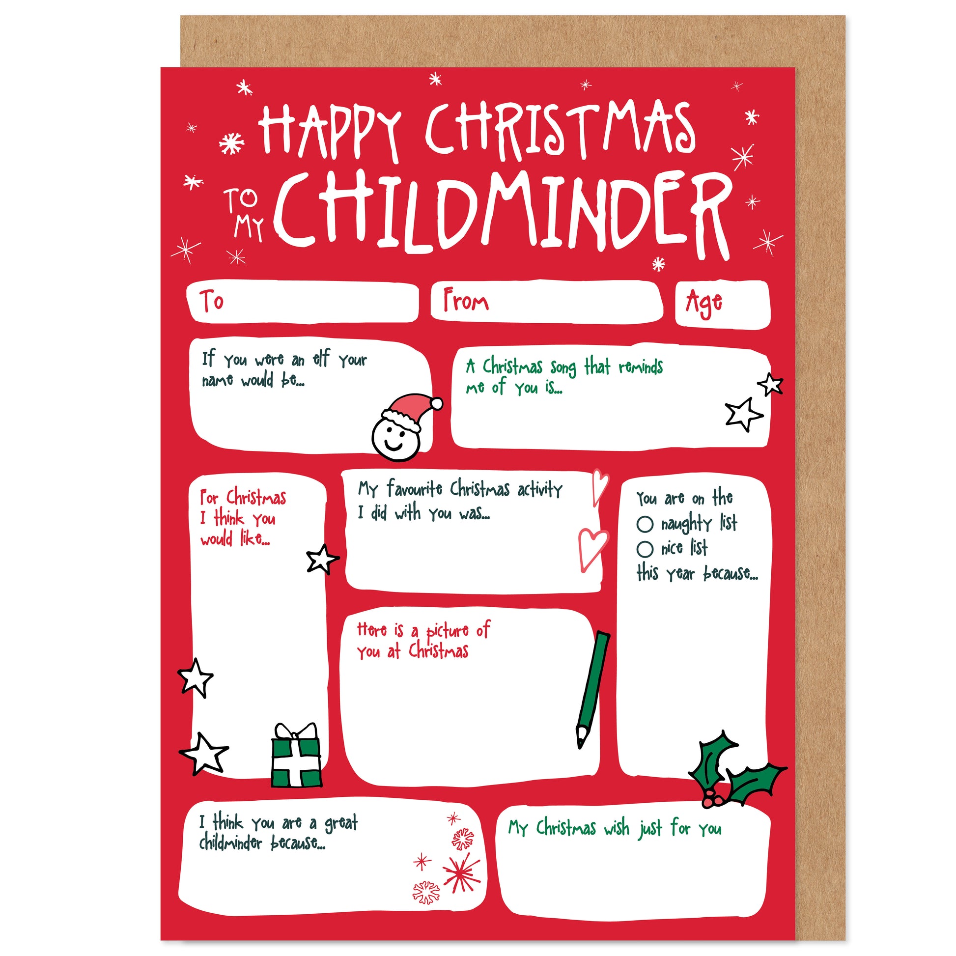 Featuring questions about your kid's childminder, this card can be completed by you on behalf of your child, or let an older child complete it themselves to make it extra personal and heartfelt.